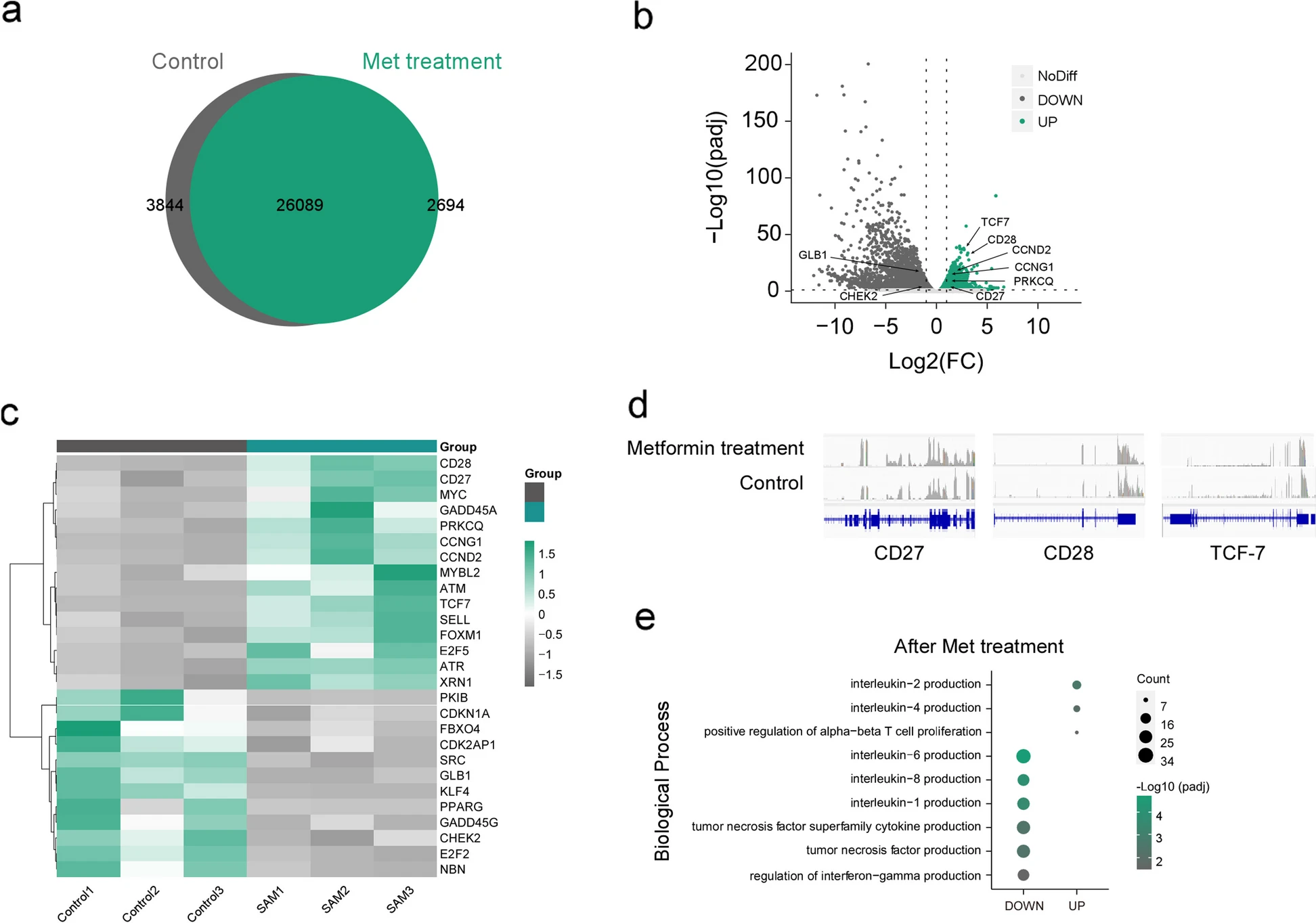 为了提供细胞衰老的详细表征,包括衰老相关的β-半乳糖苷酶 (SA-β-Gal) 的产生、端粒缩短、端粒酶活性降低、DNA 损伤增加、细胞周期停滞,他们对三位中年受试者的 PBMC 进行了转录组测序分析。与对照组相比,二甲双胍处理组与衰老相关-β-半乳糖苷酶(SA-β-Gal)相关的基因 GLB1 显著降低,DNA 损伤相关基因在二甲双胍处理后也均下调。相比而言,二甲双胍促进细胞周期素相关基因 CCNG1 和 CCND2 的表达。与端粒酶的 ELISA 检测数据一致,二甲双胍治疗组 ATM、ATR、PRKCQ 和 MYC 的表达显著升高。此外,与干性相关的 TCF7、SELL、CD28、CD27 基因表达也出现增加。此外,与淋巴细胞增殖相关的生物学过程,如白细胞介素 2(IL-2)和白细胞介素 4(IL-4)在二甲双胍组上调;然而,SASP 相关的生物学过程,如 IL-6、IL-8、IL-1、TNF 和 IFN-γ 的产生,在二甲双胍治疗后减少。总之,这些结果支持了二甲双胍促进细胞干性和端粒酶活性相关基因的表达,但抑制细胞衰老相关基因的表达。