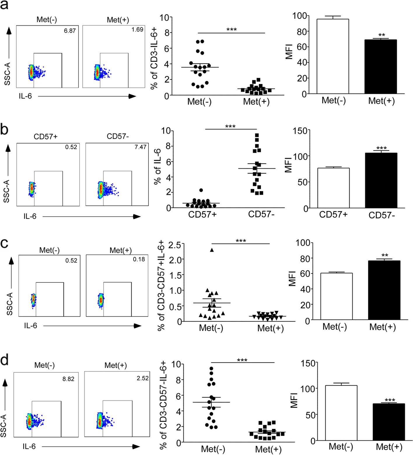 IL-6是衰老过程中存在于各种衰老细胞中的SASP因子之一。这种细胞因子主要由先天免疫细胞分泌,如单核细胞和树突状细胞(DC)。为了确定二甲双胍是否抑制IL-6的产生,他们分析了中年受试者外周血CD6阴性细胞中IL-3的分泌。结果显示,对照组细胞中 IL-6 产生率为 3.8%,而二甲双胍处理组细胞 IL-6 产生率仅为 1%。此外,二甲双胍治疗后 CD3 阴性细胞中 IL-6 表达水平显著降低。CD57 被认为是 T 细胞复制性衰老的表面标志,他们还比较了产生 IL-6 的 CD3-CD57- T 细胞和 CD3-CD57+ T 细胞的频率,发现前者的频率更高。因此,二甲双胍降低了 CD3 阴性细胞和 T 细胞中 IL-6 的产生。