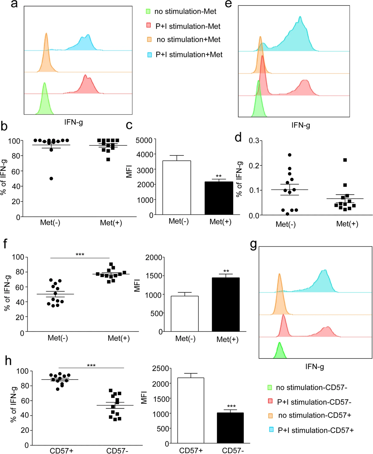 衰老T细胞分泌的SASP(衰老相关分泌表型,SASP)可能对邻近的健康细胞有害,甚至诱发衰老。IFN-γ 在衰老 T 细胞中高表达。为了研究二甲双胍是否抑制 IFN-γ 的产生,他们对来自中年组的外周血单个核细胞(PBMC)使用 20 mM 二甲双胍治疗 24 小时。结果发现,二甲双胍治疗组和对照组之间,CD8+衰老 T 细胞 IFN-γ 的产生没有显著差异,但治疗组 CD8+衰老 T 细胞中 IFN-γ 的平均荧光强度(MFI)显著降低。此外,二甲双胍治疗后,淋巴细胞中 IFN-γ 阳性 T 细胞的频率有所降低。但是对于非衰老 T 细胞,二甲双胍治疗后 IFN-γ 的产生却增加。总之,这些结果表明,二甲双胍抑制衰老 T 细胞中 IFN-γ 的分泌,但不下调非衰老 T 细胞中 IFN-γ 的产生。