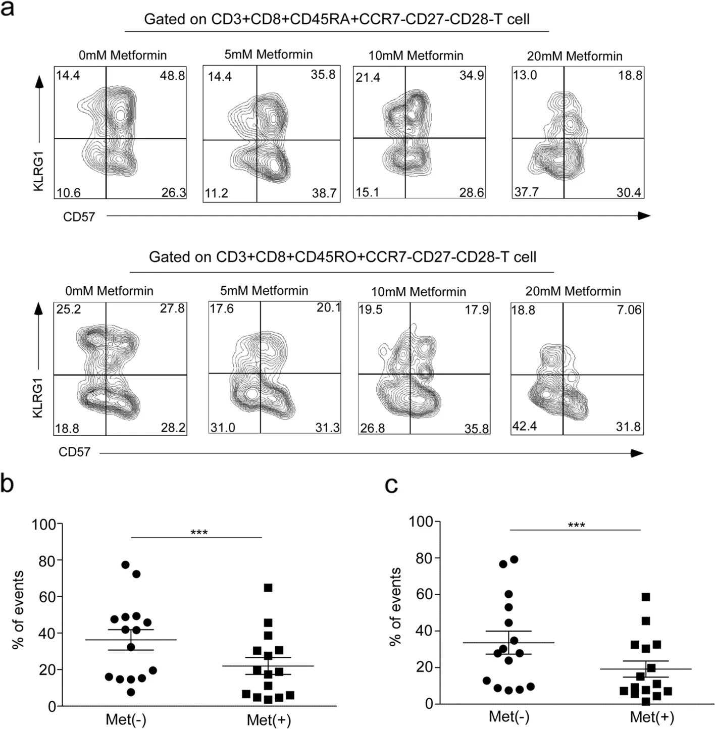 重要的是通过干预措施减少衰老的T细胞,以防止与年龄相关的疾病,特别是肿瘤的发生。二甲双胍不仅具有降血糖作用,还具有抗肿瘤和抗衰老作用。为了研究二甲双胍对衰老T细胞的影响,他们在体外用不同浓度的二甲双胍来处理中年人群的人外周血单核细胞:0mM、5mM、10mM和20mM。他们的实验证实,10 mM 二甲双胍处理后,衰老 T 细胞数量显著减少,20 mM 二甲双胍处理后,CD8+衰老 T 细胞的频率也有所下降,在 Tem 细胞中也观察到了类似的抑制效应。这些结果表明,二甲双胍可以降低中年人群中衰老 T 细胞的频率。