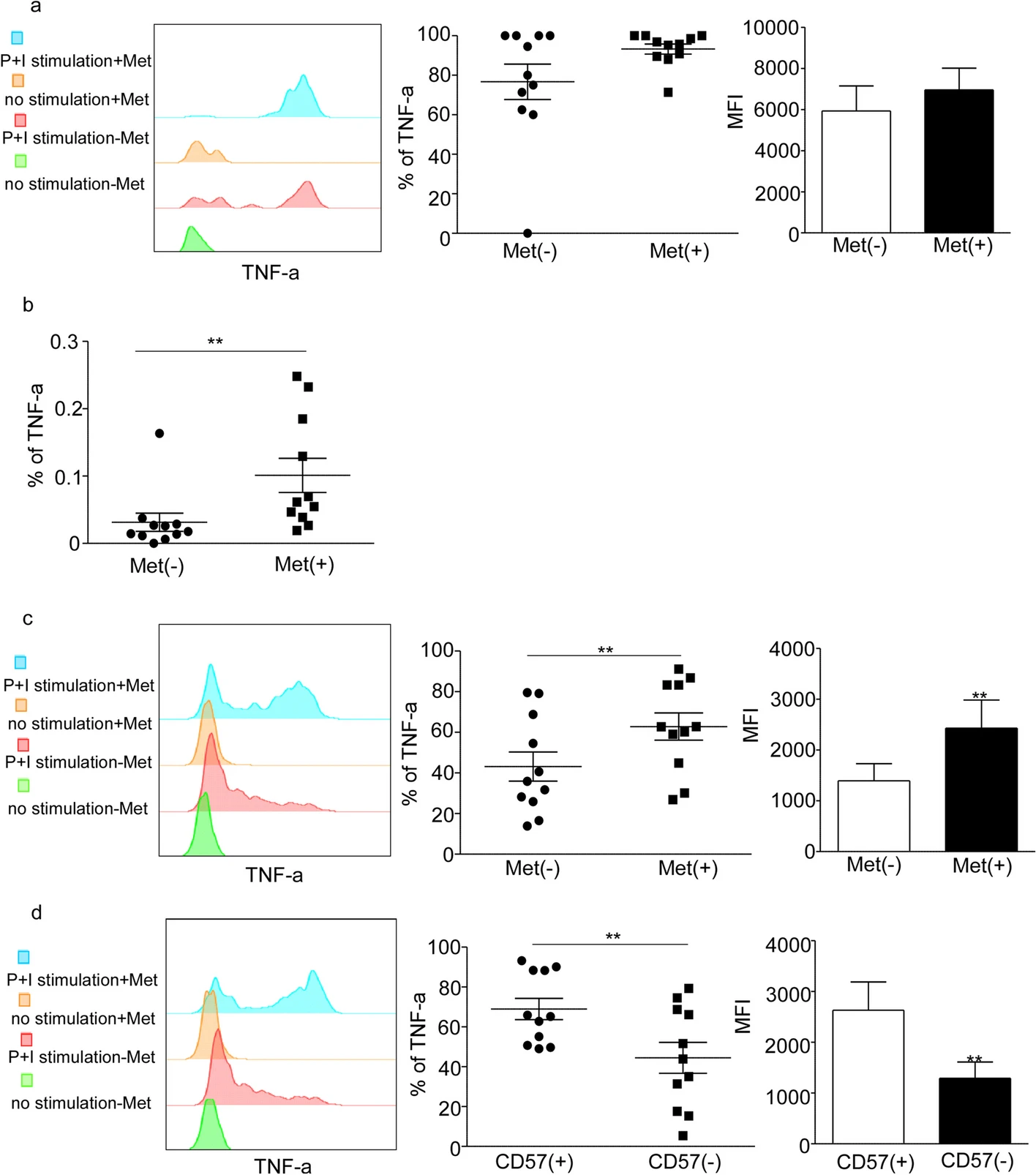 他们发现,在二甲双胍干预后,与对照组相比,CD8+衰老 T 细胞分泌 TNF-α 的趋势增加。淋巴细胞中CD3 + CD8 + CD45RA + CCR7-CD27-CD28-CD57 + KLRG1 + TNF-α + T细胞频率也有增加。在CD3 + CD8 + CD45RA + CCR7-CD27-CD28-CD57-KLRG1-T细胞中也观察到类似的结果。这些结果表明,二甲双胍促进衰老 T 细胞中 TNF-α 的产生。