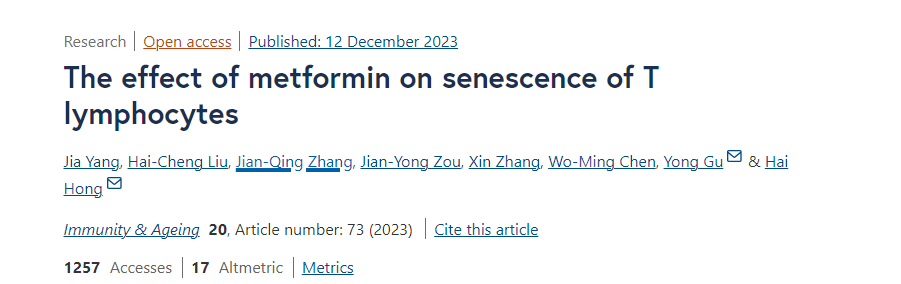 随着老年人口的急速增长,年龄相关疾病发病率的上升引发了人们的日益关注。越来越多的证据表明,免疫系统功能失调导致了老年人群患上慢性低度炎症,进而引发恶性肿瘤、内分泌和代谢疾病、阿尔茨海默病、动脉粥样硬化以及自身免疫性疾病等与年龄相关的疾病。这导致了老年人的患病率和死亡率上升。T细胞在免疫反应中起着核心作用,包括抗肿瘤免疫。随着个体年龄的增长,衰老T细胞的数量增。老化的 T 细胞表现出明显的表面标志物,例如共刺激受体 CD27 和 CD28 的表达缺失,以及 CD57、KLRG-1、CD45RA 的高表达。此外,趋化因子受体 CCR7 在这些衰老的 T 细胞中也被下调。二甲双胍是治疗2型糖尿病的一线药物。它具有降血糖作用,并已被证明具有抗癌作用、预防和治疗衰老相关疾病等其他特性,以及抑制炎症。虽然二甲双胍在免疫系统中的作用受到广泛关注,但对其对衰老 T 细胞的免疫调节作用知之甚少。2023年12月12日,来自中山大学的洪海教授研究团队在 Immunity & Ageing 杂志发表了题为 The effect of metformin on senescence of T lymphocytes [1] 的文章。他们的研究发现二甲双胍可以降低 CD8+ 衰老 T 细胞的数量。此外,二甲双胍还可影响衰老相关分泌表型(Senescent Associated Secretory Phenotype, SASP)的分泌,抑制 CD8+衰老 T 细胞 IFN-γ 的产生以及抑制淋巴细胞中促炎细胞因子 IL-6 的产生。他们的研究结果表明,二甲双胍可以从细胞数量、效应因子功能、端粒酶含量和基因表达等方面抑制中年个体的 T 细胞衰老。